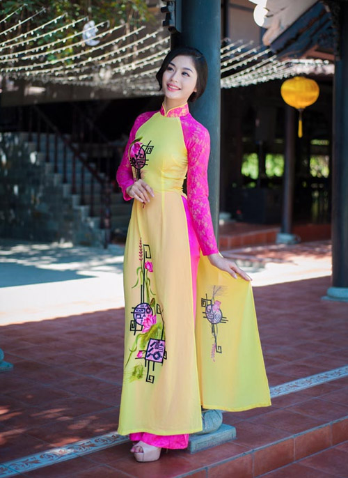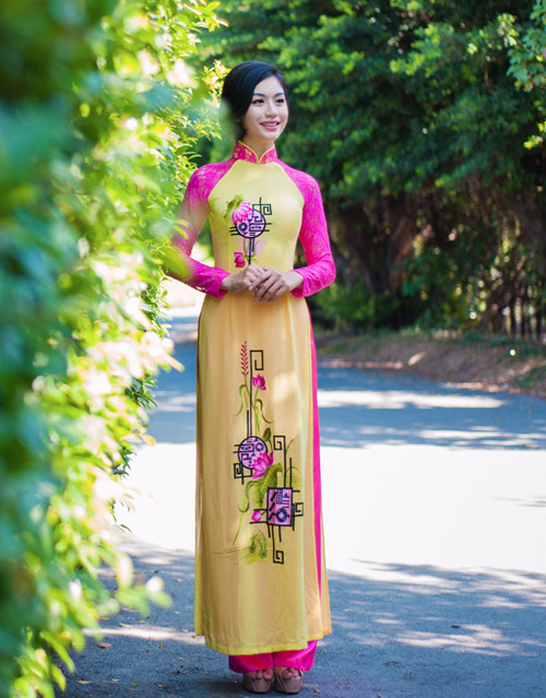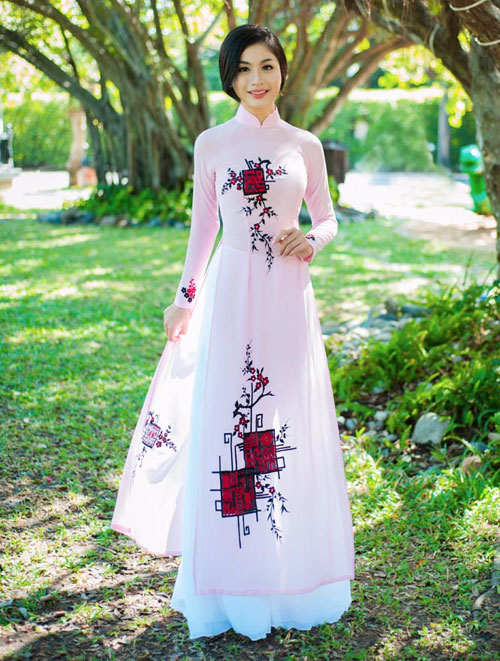 Trên mẫu áo dài mới, NTK đã gửi gắm các họa tiết hoa nổi bật, hội tụ nhiều ứng dụng, tôn vinh vẻ đẹp và sự quyến rũ cho các bạn gái trong những lần đi sự kiện, đặc biệt là nét trẻ trung, dịu dàng, lãng mạn cho cô dâu trong ngày trọng đại.